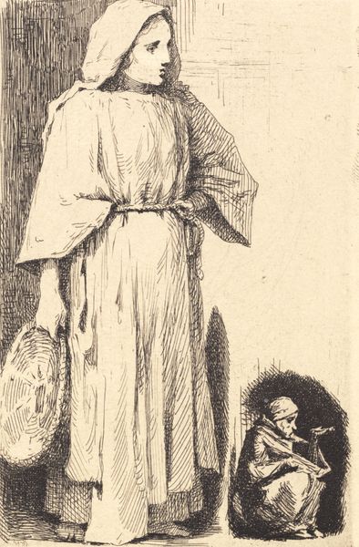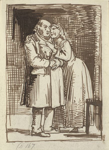 Editor: This is "Fra en præstemiddag" or "From a Clergyman's Dinner," created between 1907 and 1911 by Christian Kongstad Petersen. It’s a pencil drawing, currently housed at the SMK. I notice a certain awkwardness in their postures – the way they avoid eye contact. What unspoken dynamics do you see at play here? Curator: This piece is thick with the cultural symbols of its time. Look closely at the clothing; they telegraph status. The dark suit, the elder's garb and shawl. They position these figures within a very specific societal structure. Can you sense the implied narrative, the potential for friction or forced civility? Editor: I hadn’t really considered how much their clothes say about them! The woman in the middle looks like she's caught between the two men. Is she meant to represent a generational divide, maybe? Curator: Perhaps. The gaze is crucial. Notice how each figure looks away, burdened by duty, constraint. Consider the formal occasion implied in the title, and how it conflicts with the seemingly uneasy body language in the room. What societal norms, do you think, might be causing that discomfort? Editor: It's fascinating to think about the strict codes of conduct that would make this scene feel so heavy. So, this image acts almost as a mirror, reflecting the cultural anxieties and expectations of the era. Curator: Precisely. Art often serves as both a recorder and a decoder of societal values, embedding cultural memories in its very composition. It shows how appearances are tools for social stratification and for navigating complex familial or communal situations. Editor: That's such a thought-provoking insight, seeing beyond just the surface to the embedded meanings. It really changes how I view the image! Curator: And how wonderful it is to uncover new things together. It reveals new possibilities of our humanity reflected.