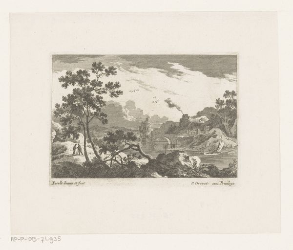 Editor: So, here we have Hendrik Spilman's engraving, "View of the City Wall and the Wittevrouwenpoort in Utrecht," created sometime between 1773 and 1792. It's incredibly detailed, almost photographic. I find myself drawn to the spire dominating the skyline. What strikes you most about it? Curator: It's fascinating how Spilman captures a moment, a place brimming with layered symbolism. The gate itself, the Wittevrouwenpoort, isn't merely an architectural structure; it represents transition, access, perhaps even a gateway to opportunity or danger, depending on the context of the viewer at the time. What feelings does the gate evoke in you? Editor: Hmm, transition, definitely. And maybe a sense of civic pride, this idea of entering a protected space. Curator: Exactly! Notice also how the waterways act as arteries. In iconography, water often represents life, purification, and the subconscious. This, coupled with the solid structure of the city walls, tells a tale of balance – the flow of life contained and protected. Do you see a tension between the natural and the man-made here? Editor: I do. The natural elements are softer, the trees, the sky… while the architecture feels very defined, rigid even. It's like a visual representation of control over nature. Curator: Precisely! And consider how the lines of the engraving itself reinforce that control. Every stroke is deliberate, creating a sense of order and clarity. The artist's technique almost mirrors the society's ambition to structure and define its environment. Do you think that reflects how city dwellers saw themselves at the time? Editor: Probably. Seeing this level of detail and intentionality definitely helps me see past just a simple cityscape. There is so much intentional messaging within it. Curator: And that’s the beautiful thing about art: a continuous, evolving message, ready to be re-interpreted in any time or culture.