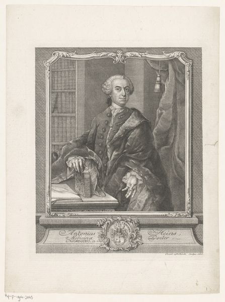 Editor: This is René Gaillard's portrait of François Castanier. I'm drawn to the way the globe and ship evoke a sense of exploration. What deeper meanings do you see in these symbols? Curator: The globe and ship are potent symbols of Castanier's world, his knowledge, and perhaps his ambition. The ship, often a symbol of journey and discovery, suggests a man of vision. What resonates with you most, knowing that images carry weight across time? Editor: I find the contrast between the ship—a symbol of forward movement—and the permanence of the portrait intriguing. It makes me wonder about the man’s legacy. Curator: Yes, portraits often aim to capture a moment and project an idea of posterity. The details like the globe and ship, together, invite us to decode Castanier's cultural place. I'm left contemplating how such visual vocabulary shapes perceptions of identity and achievement.