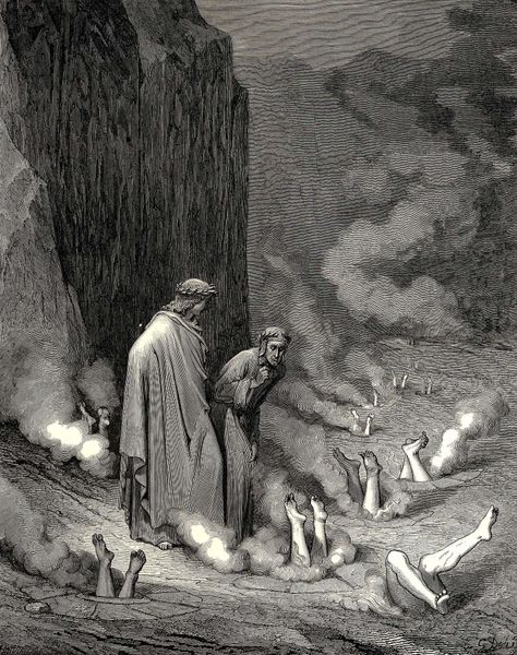 This illustration, *The Punishment of the Simonists*, was created by Gustave Doré. Look closely at the stark contrast between light and shadow, a technique Doré uses to intensify the emotional impact. The composition is divided vertically, with the monumental cliff face on the left balanced by the ethereal, smoky atmosphere on the right. This division creates a sense of tension, highlighting the contrast between the earthly and the infernal. Notice how the figures of Dante and Virgil are positioned at the forefront, their verticality mirroring the cliff, which draws the eye down into the grotesque scene of inverted bodies. The repetitive pattern of legs protruding from the ground creates a disturbing rhythm, emphasizing the uniformity of the Simonists' punishment. Doré uses line and form to transform Dante's moral critique into a visually arresting scene, where the structure itself communicates the themes of corruption and divine retribution. The lack of resolution asks us to consider that meaning is not fixed but rather an ongoing process of engagement.