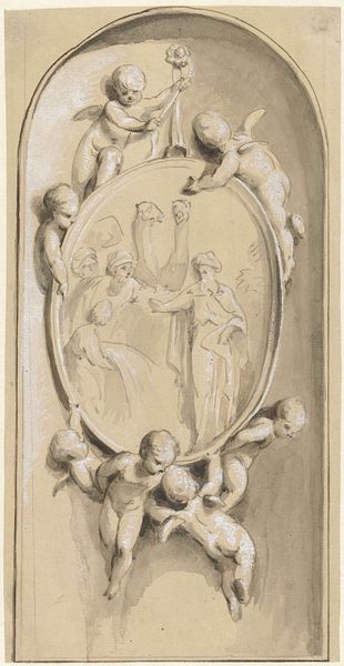Editor: This is Stefano Mulinari's "Madonna and Child with Saints," a pen and brown ink drawing. It feels very... linear. What is striking to you about the piece? Curator: Let's consider the availability and cost of brown ink and paper in 18th-century Italy. This choice indicates a calculated decision, likely influencing the composition's emphasis on line and form. How might the material's accessibility affect Mulinari's artistic choices and the social function of this drawing? Editor: That's a perspective I hadn't considered. It shifts the focus from religious iconography to the economics of art creation at the time. Curator: Precisely! Analyzing the material conditions offers us insight into the broader cultural landscape that shaped Mulinari's work. It makes you wonder about the economics behind art-making. Editor: Definitely gives me a lot to think about. Thanks!