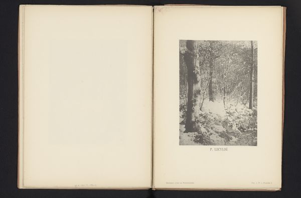 Curator: Right now, we're looking at a landscape piece called "Bosgezicht nabij Spa"–or “Forest View near Spa.” It’s a print, likely a photograph judging from the tones, created sometime before 1901 by Edouard Adelot. What's your initial take? Editor: Oh, it’s a breath. Like stepping away from everything noisy and…manufactured. I love the play of light filtering through the trees, creating these hazy layers. A forest stream in muted shades... Feels almost ghostly. Curator: Well, it’s interesting you say "ghostly." The print, reproduced within the leaves of a book about social clubs and rules for gatherings and such. I wonder if its initial circulation intended it to be something similar to an aesthetic breather from regimented social structures or bureaucratic administration... The placement suggests a connection between nature and a controlled social landscape. Editor: Perhaps, but for me the water pulls my focus, how Adelot captured its flow even in this static, monochromatic medium. It reminds me that even within systems and rules, there's a constant, ever-changing energy underneath. Like art. Like everything. Curator: Precisely, or rather, what Adelot perhaps meant for this work to imply for society circles and bureaucracy, too. This points to the interesting role of printed matter beyond text and policy. These were functional objects. Perhaps the choice of photography indicates a mass produced medium for common consumption. Editor: Perhaps. But you’ve mentioned what photography points towards to common consumption… I tend to see in the texture something that transcends industrialism: it's how a specific moment felt to him in that forest, rendered for any of us. The print process allows others access to the feelings. What you do you think about that perspective? Curator: Well I am not sure about emotional access at all times, because you bring out an aspect not necessarily made for others at all! Let's say its creator, with technical decisions impacting its distribution, and ultimate ability to access feelings that others were allowed or forbidden to hold in 1901.. Interesting piece indeed.