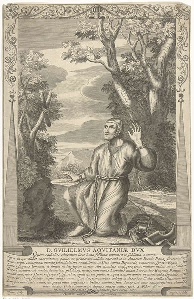Editor: This engraving, "Twee historische figuren in gesprek," depicts a conversation between two historical figures, likely produced between 1722 and 1784 by Simon Fokke. It has a rather serene and composed feel about it. I’m curious, how do you interpret the dynamics at play here? Curator: What immediately strikes me is the construction of power through representation. Fokke’s choice to depict this scene in a garden setting, typically associated with leisure and the aristocracy, situates these figures within a very specific social and political context. Who are these figures? Understanding their roles within their historical moment—their participation in political discourse, their impact on social structures—is key to unraveling the intended meaning of the engraving. What can we deduce about their relationship? Editor: The print labels them as Ph. van Marnix and Jer. Beverningk. Given that Marnix was a writer and statesman and Beverningk a diplomat, would it be fair to consider this idyllic image to be in direct contrast with the conflicts each would encounter in their professional lives? Curator: Precisely. And let’s think about the role of art during this period. Prints like this weren't merely decorative; they served as a form of public engagement. How did Fokke utilize this print to create and disseminate historical narratives, possibly influencing public opinion and the social status of his subjects? The print suggests both are intellectuals from the upper social class. What might it reveal about class dynamics, elitism, and access to power in 18th-century society? Editor: That’s fascinating, seeing how much socio-political analysis can be extracted from a seemingly simple image of two men in conversation! Curator: Absolutely. By engaging with the historical context and social undercurrents, we can gain a much deeper understanding of this piece. Hopefully that deepens your appreciation as well.