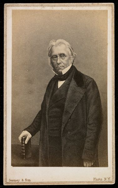 Curator: There's a captivating stillness to this gelatin silver print. A formal portrait, of course, but the mood strikes me as so quietly intense. It’s by Jeremiah Gurney and it portrays Michael Faraday. The image was created between 1858 and 1869. Editor: He looks like he has just materialized from a wisp of smoke, sitting with a weighty book as a symbol of the inaccessible wisdom he seems to hold, don't you think? It feels almost dreamlike for such a sharply defined photograph. Curator: Dreamlike... yes, that’s a fitting way to describe how the burgeoning technology of photography sought to capture—and elevate—notable figures like Faraday. Gurney was very much catering to a specific desire for portraits that echoed the grandeur and decorum of painting. The studio even took great pride in its client base of influential political and social actors. Editor: Well, I certainly feel the effect. It does feel constructed to emanate power and gravity...almost like he is meant to appear beyond us, as a superior being. He really does look like he's in on some secret about the universe. His relaxed posture contradicts the very concept of forced perspective though. Curator: Ah, but isn't that the charm of it all? He appears as approachable and elevated at the same time. I feel this was a tactic of portraiture in those days: To immortalize scientific thought, while celebrating scientists who unlocked and shared those mysteries for society to use and understand. I wonder if he posed with that very intention? Editor: Hmm, yes, a very canny balancing act for Gurney, giving us an alluring peek into the life of a science titan! I find it especially telling when you realize he dedicated a good deal of his life trying to bridge those perceived rifts between science and society. A real paradox embodied by one quiet picture.