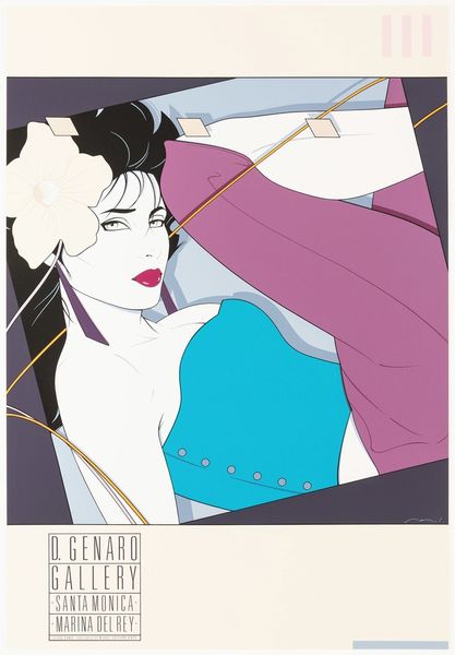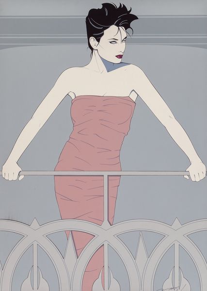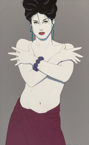 Curator: Here we have Patrick Nagel's piece, "Posing." It is created using acrylic paint, showcasing his iconic modernist style. Editor: Well, my immediate response is the flatness of it all. It feels so deliberately constructed, like an advertisement in its clean lines, almost too clean for comfort. What about you? Curator: Yes, it is an immaculate quality—very of its time. I am intrigued by how he utilizes hard shadows, giving dimension with what seems like so little effort. The shadow and stylized lines carry so much symbolic weight, defining form and emotion through reductive shapes. It resonates with the ancient practices of simplifying deities into readable signs. Editor: I can appreciate the simplification as an element. For me, I look to the use of acrylic; a decidedly modern, manufactured medium. What does using that material say? There's a mass-produced aesthetic being carefully composed. The labor is invisible. Curator: I see that connection to manufacturing, and perhaps a critical commentary, given that female forms are often manufactured and marketed. Her posture, that open shirt, might represent a power but also a vulnerable exhibition. Does she want our gaze, or is she challenging us? Editor: Perhaps both? It’s difficult to ignore the tension, as you say. It is a question of power dynamics and material agency in rendering these women's forms and what expectations they might be countering by their very visible labor on their own images and brands. Curator: This acrylic really amplifies this. Thanks for drawing my attention to its impact! It gives an intriguing context that shifts how to examine the art and this period of portraiture. Editor: A valuable shift indeed. Thanks for discussing the symbolic meaning of its composition today!