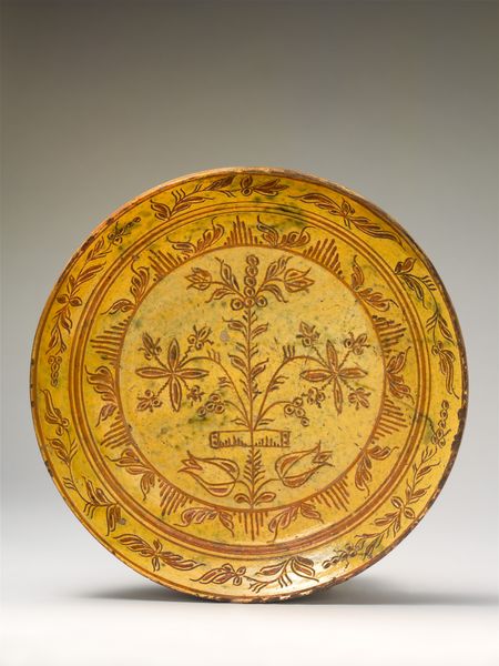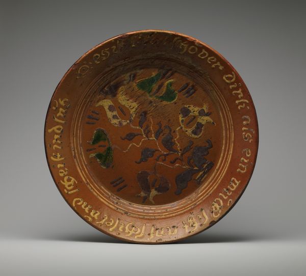 Editor: Here we have Samuel Troxel's "Plate," created in 1846. It’s earthenware, a piece of folk art from Pennsylvania on display at the Met. The colors are so muted, almost autumnal. I’m immediately drawn to the central image of a dove with “Liberty Fr. Polk” written above it. What catches your eye about this piece, particularly from a historical perspective? Curator: Well, what I see is a fascinating piece of material culture deeply embedded in its socio-political moment. Consider that this plate was made during a period of intense political engagement, particularly with the presidency of James K. Polk. The slogan “Liberty Fr. Polk” – presumably “Liberty, for Polk" – speaks to the politicization of everyday objects and the fervent support that political figures garnered, or, indeed, attempted to manufacture, through visual culture. Editor: So, it’s almost like a campaign poster…but on a plate? Curator: Exactly. These decorative objects reflect how political ideologies permeated daily life, extending even into the domestic sphere. The ceramic material is key, as it shows these ideals and views are widely available across society, compared to more expensive materials that would have confined it to wealthier patrons. Does the image of the dove relate to any specific political ideologies? Editor: The dove usually symbolizes peace, so maybe there's a message of hoping for peace under Polk's leadership? The artist even put initials along with his name, possibly indicating a signature with other contributors. Curator: Precisely. And remember, Polk's presidency was defined by expansionism and conflict. So the presence of peace, with a possible shared production, creates layers to explore the sociopolitical complexities of the era and what "peace" may have implied for different parties involved. Thanks to the lettering around the plate edge, the maker encourages the consumer to internalize these viewpoints during dinner. Editor: I see how the context really brings a richer meaning to what I initially just saw as a simple folk-art piece! The cultural setting makes a great deal of difference in its reception and meaning. Curator: Absolutely. It’s through understanding its place in history that we can truly appreciate its significance.