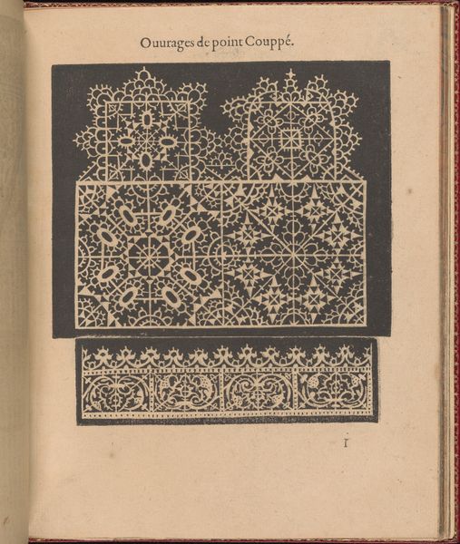 This is page 20 from "Les Singuliers et Nouveaux Portraicts…", made by Federico de Vinciolo in the late 16th century. It’s an instruction manual, of sorts, demonstrating patterns for cutwork lace, or “point couppe”. Printed in black ink, the design stands out crisply against the white paper. Notice the intricate, repeating motifs, combining geometric shapes with stylized floral elements. These patterns were not just decorative; they were templates meant to be painstakingly replicated in fabric using scissors and needle. Cutwork was highly fashionable during the Renaissance, a mark of luxury and refinement. But its production relied on countless hours of skilled labor, often by women working in workshops or at home. This book gave makers access to design ideas, and also served to reinforce the social value placed on finely wrought, handmade goods. By preserving these patterns in print, de Vinciolo elevated a practical craft to the level of art. So, next time you see a piece of lace, remember the complex interplay of design, labor, and social status that it represents.