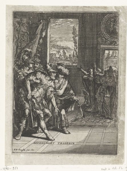 Curator: Before us is Jan Punt’s “Man ontvangt een brief”, made in 1739. It is currently held at the Rijksmuseum and created via engraving. What strikes you when you first see this image? Editor: The rigidity of the scene is the first thing that hits me. Every figure, every fold in the curtains, seems to adhere to an almost architectural plan of sharp, clear lines, reflecting an inherent class division. Curator: Yes, and Punt, operating within the Baroque style, certainly crafts a world deeply embedded in its own social artifice. The image hints at societal performativity. Look how the letter itself is central, literally and metaphorically dictating the actions of everyone surrounding the receiver. Editor: The letter seems a powerful symbol—a conduit for social or political machinations. It reminds us that even in seemingly candid moments, codes of communication shape perceptions and outcomes. Curator: Absolutely, letters in this period wielded enormous power; controlling reputations, economies and dictating access. Jan Punt, as an artist operating in that context, makes that power and influence central. What appears to be happening in the background beyond these figures in the foreground? What can you discern beyond them, into the further space? Editor: There’s definitely a strong sense of theatre, wouldn’t you agree? The arrangement, with the gathered onlookers, the open curtain, even the posture of the letter’s recipient, carries a sense of drama. It all creates a visual metaphor of society's constructed norms and power structures laid bare in front of you and me, as spectators. Curator: Yes! And the engraving technique mirrors the age, mass producing images so these ideas circulate, challenging or reinforcing notions of status and decorum. Jan Punt captures how such norms influenced self-perception at that time, and invites us to think critically about this even now. Editor: A fascinating glimpse indeed; a testament to art's ability to reflect society’s image of itself. Curator: Precisely, a dialogue then and now.