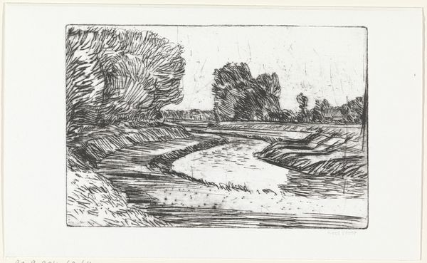Curator: This piece by Anna Ostroumova-Lebedeva, titled "Willows near Novosilviysky Bridge," created in 1923, presents a rather somber, even melancholic mood, despite the ostensibly pastoral subject. Editor: Indeed. The stark contrast between the dense blacks and crisp whites yields a dramatic, graphic quality. The composition seems meticulously crafted. The balance between light and shadow evokes a certain sense of depth and volume, which is quite remarkable for a woodcut. Curator: As a woodcut, its medium is deeply connected to the socio-political context of early 20th-century Russia. Printmaking allowed for wider distribution of imagery and ideas during periods of immense social upheaval and reform. The printmaker becomes a conduit. Editor: Looking closely, the deliberate variations in line thickness command attention. The reflections in the water, the foliage—each element rendered with remarkable precision. There's an almost geometric underpinning that provides structure. Do you agree? Curator: Certainly. This area of the city played an important role. Following the revolution there was interest to make art accessible. Note the almost utilitarian aspect; how the scene transforms into a visual experience accessible and easily distributable to all levels of society. Editor: I am intrigued how it defies conventional landscape expectations. Although appearing quite accessible on first encounter, it becomes structurally complex when viewed closely, using a binary spectrum to represent this quite subtle landscape moment. Curator: Absolutely. Lebedeva's landscapes served not merely as aesthetic exercises, but played a larger role in fostering pride and celebrating spaces amongst the Russian population. Editor: Reflecting, I would consider this print as more than just a recording of a natural scene; it stands as a well-crafted intersection where graphic art and deeply contextual societal aspects interweave. Curator: Yes, exactly. It gives a unique window into how art acted during intense change within a society seeking reform. It reveals, more than merely aesthetic talent, her awareness of how art functions as public discourse.