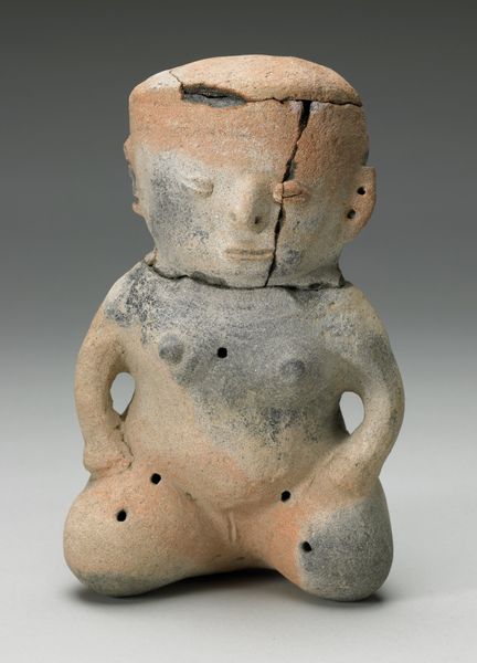 Editor: Here we have a Moche mask, crafted sometime between 100 and 500 AD from ceramic and metal. The wear and tear really strike me. What story do you think its imperfections are trying to tell? Curator: That weathering is key, isn't it? It forces us to think about time, power, and the body. Moche society was deeply stratified. The elite used objects like this to project authority, often drawing on potent religious symbolism. How do you see the power dynamics at play here? Editor: Well, the materials feel really significant, especially the contrast of the ceramic and metal. One seems almost delicate, the other durable, like the contrast of humanity and... divinity? Curator: Exactly! And consider the labor involved. Someone, or more likely many people, were compelled to mine, process, and sculpt these materials. The mask then becomes evidence of forced labor and resource control. What does the face itself convey to you? Is it individualistic or idealized? Editor: Hmm, it’s definitely stylized, and seems to represent some specific person but it’s hard to tell with all the damage it has endured over the years... I wonder what significance it had in its own era? Curator: Yes! It compels us to question whose face is being memorialized. Is this an act of reverence, or perhaps an assertion of dominance? Think about contemporary discussions around portraiture – who gets represented, and how? What impact does that have? The mask becomes a mirror reflecting not just a face, but a whole society's values. Editor: That makes me consider the indigenous Americas through a totally new lens. It's incredible how much history a single object can embody. Curator: Absolutely. It challenges our preconceived notions and invites a critical engagement with the past.