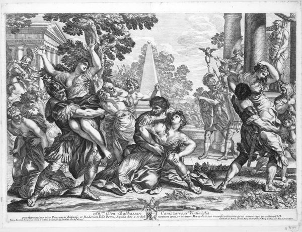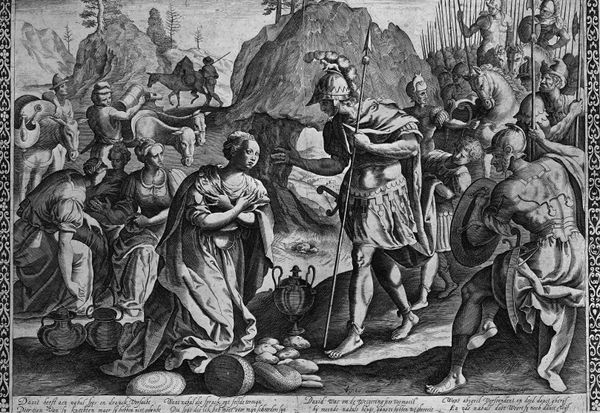 Bartolomeo Pinelli created this print of 'The Death of Epaminondas' using etching, a process that democratized image-making in the 18th and 19th centuries. The original drawing would have been incised into a metal plate, and then multiple impressions pulled in a printing press. Prints like these were relatively inexpensive, and that's key to their cultural importance. Unlike unique paintings or sculptures, prints could circulate widely, bringing imagery and ideas to a broad audience. The depicted scene, based on ancient history, is rendered with great detail, showcasing Pinelli’s skill. The emphasis is on line work, built up through hatching and cross-hatching to create areas of tone. Notice the way the etching captures the texture of the soldiers' garments and shields, and even the leaves of the trees. This wasn't just about making copies; it was about spreading knowledge and shaping public opinion. Pinelli's print participates in a larger story about the relationship between art, labor, and the rise of mass media. It reminds us that art is not just about individual genius, but also about the technologies and social structures that enable its production and distribution.