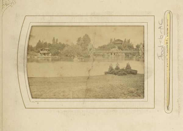 Curator: Well, here we have "Park in Teheran, Iran," a photograph dating from around 1885 to 1910, credited to Antoine Sevruguin. What's your first impression? Editor: Hushed. Like a secret garden slumbering in the heat. There’s this delicate tonal range, sepia bordering on silver, that lends it such a nostalgic, almost mournful air. It's beautiful, but with a certain melancholy. Curator: It does have that vintage feel, doesn't it? I’m struck by the way Sevruguin captures both the designed artifice of the park, the carefully laid out paths, the architecture – and contrasts this with the hazy, almost dreamlike quality of the distant mountains. He frames paradise as something quite real. Editor: Absolutely. It's the ordered nature tamed. Those lampposts along the pond evoke Western influence, a very specific visual language, juxtaposed against an ancient, softer landscape in the background. Is that supposed to echo a memory of Europe? Curator: Perhaps. Sevruguin was a fascinating figure, really, with a Russian father and Georgian mother, working as a photographer in Iran. He portrays it in that somewhat clichéd style we now term "Orientalist," though his intentions, his relationship to the place itself, may have been more complex than that label suggests. Editor: I suppose. The lake, like a still mirror reflecting sky, pulls me right into its placid surface. Water carries profound significance throughout culture – reflecting not just appearances but also internal depths and transitions. What do you feel the pond might signify within this cultural and personal framework? Curator: Interesting! I read it perhaps a bit more plainly – simply as an element of designed leisure, a feature to attract wealthy Tehrani society to the park. A sign of status and cultivated taste. But your interpretation of the water opens it up. The still water hides the real depth. Editor: Agreed, it holds an immediate reading, absolutely – leisure and status – that might have to work as a deliberate construct, to offer an imagined world. It all goes together – designed space, natural symbols – to forge an entire reality. Curator: Yes, quite! Seeing it now, your focus has heightened for me the staged artificiality, which invites its audience to accept something just slightly removed from the authentic world. Editor: In that sense, images carry the echo of culture and memory through constructed design and framing, don't they? It’s lovely how one still image can open the gates on so many potential directions. Curator: It does – a quiet, intriguing park captured on film that speaks volumes about art, culture, and representation.