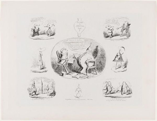 Curator: This artwork by George Cruikshank is titled "A Gentleman's Rest Broken in Consequence of Going to Bed with his Leg On." Editor: What a series of amusing vignettes! They seem to capture everyday mishaps with a lighthearted touch. The composition, in its gridded arrangement, feels almost like a page from a visual encyclopedia of unfortunate events. Curator: Indeed. Cruikshank, known for his satirical illustrations, uses this series of images to explore themes of folly and misfortune, rendered with a strong sense of line and meticulous detail. Notice how each scene is framed, creating individual units within the larger whole. Editor: The symbols resonate strongly. The broken leg is literal, of course, but it also hints at broken societal norms, perhaps ridiculing a certain aristocratic pretension. And I find the recurrent imagery of domestic mishaps wonderfully universal. Curator: It’s a fine example of how the artist employed caricature to expose social absurdities. The visual language itself—the exaggeration of form, the dynamic compositions—speaks to a deeper critique of societal mores. Editor: I see a timeless commentary here, cleverly embedded in seemingly simple, comical scenes. Curator: Precisely. Cruikshank's technical skill elevates the work to something truly insightful. Editor: A potent blend of humor and observation, a mirror reflecting our shared human foibles.