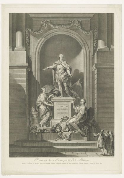 Editor: Here we have Giambologna's marble carving, "Cristo Risorto E I Ss. Pietro E Paolino Del Giambologna", from around 1579. The grouping feels so theatrical, almost staged, and the architecture is just as much a part of it as the figures. How do you read the socio-political context in something like this? Curator: It's impossible to separate a work like this from its patronage and intended function. We have to ask: who commissioned this and why? In late 16th-century Italy, the Church was a powerful, and wealthy, patron of the arts, particularly seeking to reaffirm its authority in the face of the Reformation. Think about what messages this sculpture might communicate about power, divinity, and the role of the Church. The elevated position of Christ, flanked by pillars of the Church… does that say something to you? Editor: So, the visual language isn't just aesthetic, it’s reinforcing institutional power. The figures almost feel like advertisements. Curator: Exactly! And note the material – marble. It evokes classical antiquity and implies permanence, enduring strength. Everything, from the Latin inscription above to the careful balance of figures, is calibrated to create a specific effect on the viewer. We are not just meant to admire, but also to believe. Do you see any tension between religious art and the artistic personality? Editor: That’s fascinating, this has really made me think about the political charge embedded in artworks that I would otherwise see as religious or devotional. Curator: Indeed. This piece acts as both an art piece and a historical artifact. Considering the history behind pieces like this offers a unique lens for us to comprehend Renaissance society and values.