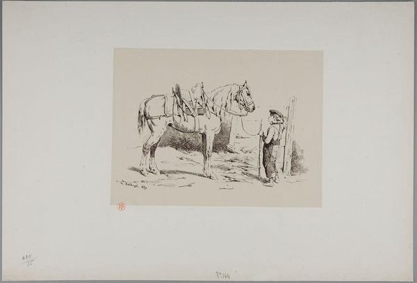 Curator: What immediately strikes me is this palpable sense of weary resignation. It's delicate yet imbued with profound melancholy. Editor: Indeed. This etching, made in 1823 by Théodore Géricault, is entitled "Jockey stapt met zijn paard" and currently resides here at the Rijksmuseum. It offers an insightful glance into the relationship between man and animal, set against what appears to be the backdrop of equestrian sports. Curator: The etching’s stark simplicity underscores its raw emotional depth. The bond depicted goes beyond mere functionality. The way the man gently leads the horse suggests intimacy or understanding—a mirroring of burdens shared. Editor: Géricault, deeply rooted in Romanticism, masterfully employs symbolism. The horse—a longstanding emblem of strength and freedom—now walks wearily beside his rider, who seems equally depleted. Is it representative of society’s toils during that period or maybe something more intimate from the artist’s life? Curator: Absolutely! There's also a spiritual parallel between rider and horse; the horse’s spirit subdued reflects maybe an imposed or adopted restraint upon natural instinct and passion. Consider this too—equestrian culture has always symbolized human control over the natural world; it brings to bear ideas on the morality of domination, both individual and institutional. Editor: I feel an honesty in Géricault's method that heightens this further; the quick etching marks do little to glamourise or elevate but serve only to record something fleeting, capturing essence over grandiose narrative. The narrative implied through pose, composition and gesture suggests an exhausted partnership rather than conquest. Curator: It resonates with archetypes far deeper than sporting pastime, reflecting instead themes tied closely with fate, shared mortality and endurance amid trials—universal even! And to circle back, consider how the simplicity of line work facilitates emotional intensity here— it isn’t reliant upon detail— rather its economy amplifies pathos embedded throughout history with equines. Editor: Exactly, it is a visual poem about shared burden—enduring together! Each glance further rewards observation, making "Jockey stapt met zijn paard" more profound upon each visit. Curator: And Géricault gives space for one to connect to those historical archetypes. I agree; let's make our way onward.