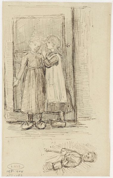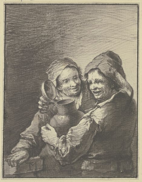 Editor: We’re looking at "Two Fat Peasant Women," an ink and wash drawing by Constantin Guys, from the 19th century. The figures have such weight and presence... almost looming despite the relatively small scale of the work. What do you make of it? Curator: Oh, I find them wonderfully solid! Not fat, darling, substantial. See how Guys uses the ink washes – puddling the grey tones to give volume and shape. It’s almost as if he’s sculpting them with light and shadow. There's an unapologetic quality to them. I imagine them gossiping with gusto. Do you get that feeling, too? Editor: Absolutely. They’ve got an attitude, a sense of self-possession. But it’s interesting you call it sculpting… I was struck by the sketchiness, like a fleeting impression rather than a fully formed portrait. Curator: Yes, it's both, isn’t it? Like catching a butterfly but preserving its very essence! Guys wasn’t about photographic realism; he sought to capture the spirit of his time. These women, in their everyday attire, represent a particular social reality, unvarnished and true. Perhaps even romanticized? Editor: That's interesting! It makes me consider who his intended audience was. It definitely challenges the traditional notions of beauty of the time, but you are right. It's definitely got a unique spark that he captured with only ink on the canvas! Curator: Precisely! A fleeting spark captured for eternity. Which, when you think about it, is the magic of art, wouldn't you agree? Editor: I definitely would. Thanks for walking me through this one, I'll see it with new eyes from now on.
