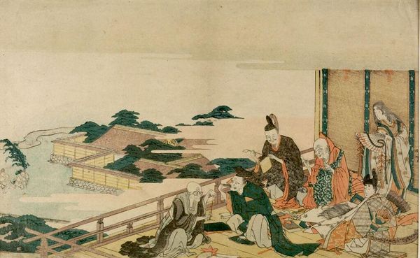 Editor: This woodblock print by Hokusai, "Poem by SanjÅ-in," part of the series "One Hundred Poems Explained by the Nurse," really captures my attention. The full moon seems so prominent. What symbols or deeper meanings do you see in this composition? Curator: The moon, often a symbol of feminine power and cyclical time, is here juxtaposed with the bowing figures. Notice their postures, almost mirroring the moon's fullness and humility. Does this evoke any feelings about the relationship between humanity and nature? Editor: It does make me think about respect and finding our place in the world. Curator: Indeed. Hokusai uses the moon to remind us of larger forces beyond our individual control, a common theme in Japanese art. It's a dance between human action and natural cycles. Editor: I never thought of it quite that way. Thanks for pointing that out. Curator: It encourages reflection, doesn't it? Art can reveal our shared cultural understanding.