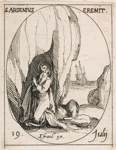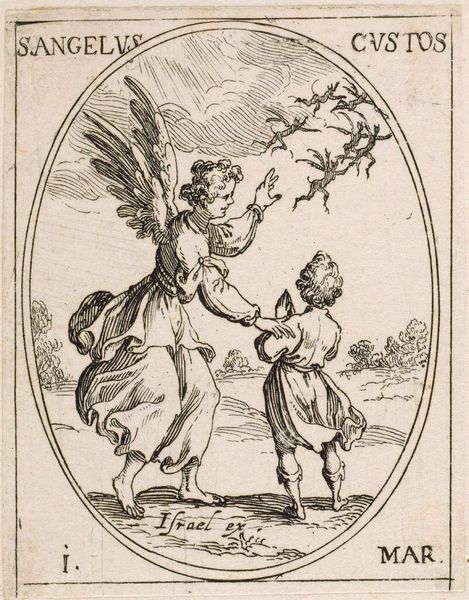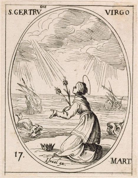 Editor: Here we have Jacques Callot's "Saint Ildefonsus," a small etching. It's quite detailed despite its size, and there is a striking contrast between the divine figures and the earthly landscape. What compositional elements stand out to you? Curator: Notice the oval frame. It’s an aesthetic choice that directs our gaze inward. The curvilinear lines within—the clouds, the drapery—create a dynamic tension against this static form. How does this interplay affect your interpretation? Editor: I hadn’t considered the impact of the oval. It seems to amplify the ethereal quality of the scene, containing and elevating the divine interaction. Thank you. Curator: Precisely. Callot's masterful use of line and form elevates the work beyond a simple devotional image.
