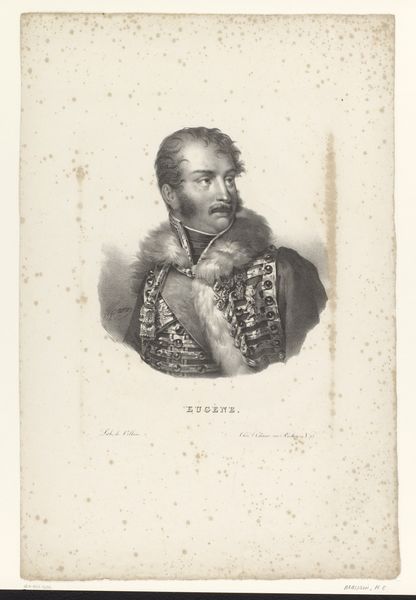 This is André Charpentier-Bosio’s lithograph portrait of General Josip Jelačić. Notice how the artist's linear emphasis creates a detailed depiction of the general's uniform, imbuing it with a sense of materiality. The rows of buttons and ornate braiding suggest a fascination with hierarchical structure. This echoes not only the strict lines of military authority, but also the semiotic function of clothing as a signifier of status. The lithographic technique allows for a subtle gradation of tone, contributing to a play of light and shadow that models the general's features. Here, the artist engages with the philosophical notion of visibility and representation. The portrait captures Jelačić's likeness and uses it as a vehicle for projecting power. The overall effect is one of controlled authority, reflecting the subject's position within the social and political framework of his time. As you consider the detailed rendering of the general’s figure, appreciate how the artist’s approach reinforces the symbolic order of its time. This artwork offers a view into the complexities of how visual representation can be an exercise of power.