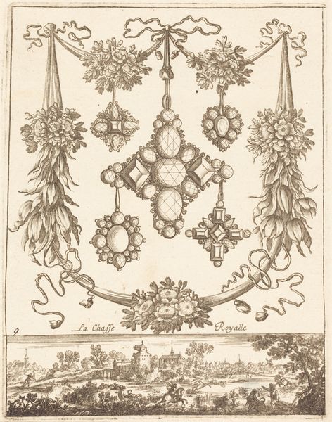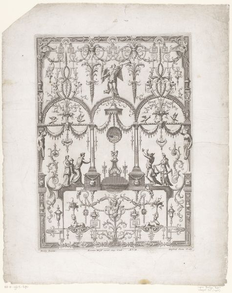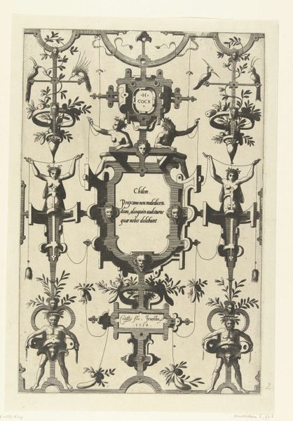 Curator: At first glance, this piece feels like a tightly wound mechanism, or a delicate cage. All fine lines and curious characters trapped within. Editor: I agree! And, visitors, we're currently looking at a print titled "Cartouche met tekst van Bias tussen twee saters in rolwerk" by Johannes or Lucas van Doetechum, dating from 1558 to 1630. It's an engraving held here at the Rijksmuseum. Tell me more about the mechanical feeling, though? Curator: The symmetry and repetition lend themselves to it. The satyrs feel like weights or counterbalances in some strange apparatus. Looking at it from an intersectional lens, I'm struck by how these classical, mythical figures are being put to work, almost industrialized. Are they being deployed to uphold a system, a set of values embedded in the inscription? Editor: An intriguing thought! I see this cartouche primarily as an example of masterful engraving, with particular focus on its function within the printmaking trade. The paper stock, the inks available during that time… Consider the socio-economic context that allowed for workshops and apprentices, and access to specialized tools. Curator: Absolutely. The production itself reflects its time. But it also mirrors deeper tensions. We see satyrs, often symbols of hedonism and freedom, framed by a rigid, ornamented structure. The text itself suggests a moral framework. I'm keen to understand what the intended viewers of this print would have brought to that reading. Editor: That tension between freedom and constraint you pointed out is central to mannerism. Notice the way space is flattened, pushing forms toward the viewer. It challenges classical balance. Think of how engravers worked, not merely replicating images, but interpreting them. Consider too, the physical demands. These are handmade objects of value because they are also labors of skill. Curator: How the artistic labor translates, what gets consumed, reproduced, re-interpreted… Fascinating. I'll keep that in mind as I consider its place within the evolving discourses on societal norms, both then and now. Editor: Likewise! Analyzing it this way—the artistic labor against societal messaging —lets you see these things from all angles. Thank you!