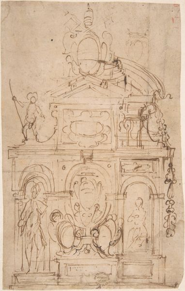 Fabrizio Boschi drafted this architectural decoration with pen and brown ink, and red chalk. At the core, we find the standing male figure within a niche, echoing classical statuary, symbols of virtue, and authority. But observe how Boschi crowns this figure with both cherubs and skulls. The cherubs, symbols of divine love, flank what appears to be a heart. The skull, that memento mori, is a stark reminder of mortality. This juxtaposition is not a contradiction, but a profound commentary on the human condition. Consider its recurrence—from ancient Roman triumphs, where a slave whispered "remember, thou art mortal" to the victor, to Baroque vanitas paintings where skulls sit alongside blooming flowers. This drawing is a powerful example of how symbols persist, evolve, and ultimately, reflect our deepest fears and aspirations, engaging viewers on a subconscious level through an interplay of death and beauty. The cyclical progression of these symbols resurfaces and takes on new meanings as time moves on.