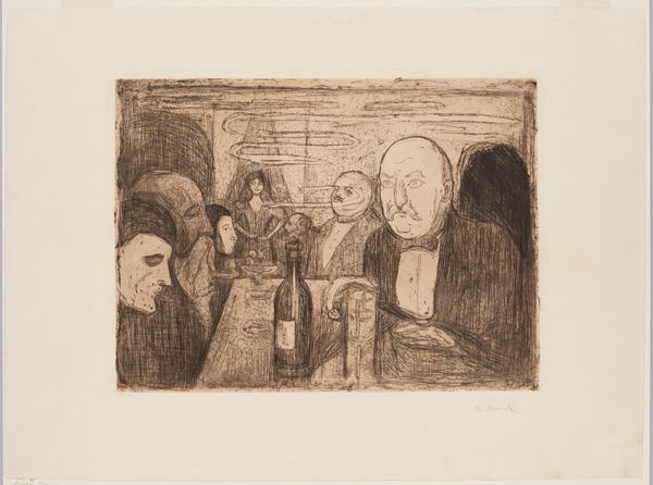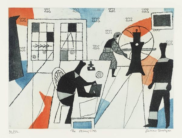 Curator: This woodcut is titled "Gerichtsszene aus Shaw’s heiliger Johanna," or "Court Scene from Shaw's Saint Joan," created by Ernst Ludwig Kirchner in 1925. What stands out to you first? Editor: A feeling of stifled power—oppression, really. The stark color blocks and crude, heavy lines project a sense of dread and imminent injustice. Curator: Indeed, Kirchner’s utilization of the woodcut medium is crucial. The gouges and cuts he makes directly into the wood dictate the composition. Note how he deploys a limited palette: the monochrome offset by aggressive red accents. The graphic lines create dramatic planar relationships and intense visual rhythms across the surface. Editor: That intense red pulls the eye immediately to the figures on the left. They are clad head-to-toe, reminiscent of executioners or inquisitors, hooded and faceless. It emphasizes the idea of unseen, unaccountable power. Then you have the more clearly defined, seated figures. I interpret these as members of the court, of the establishment. Kirchner cleverly juxtaposes these opposing powers, almost making them seem theatrical. Curator: Absolutely, it's staged. Observe how Kirchner places the main figures in a very shallow space, compressed to the foreground plane, reminiscent of theatrical tableaux. This flatness accentuates the emotional and psychological tension rather than any illusion of depth. Also note how his style deliberately diverges from naturalistic representation. Editor: The figure of Joan herself, I presume, stands in stark contrast. She seems almost illuminated, despite the prevailing gloom of the woodcut medium. Her stance is both defiant and vulnerable, highlighted against the rigid geometry surrounding her. This isn't just a depiction of a court scene; it embodies a clash of ideologies, a rebellion against conformity. Curator: Very well put. In considering Kirchner’s larger body of work and context, you see how these distorted forms and jarring juxtapositions become a visual language for the psychological turmoil prevalent in Expressionism. The formal elements here, line and color, are intentionally deployed for maximum emotional impact. Editor: Studying Kirchner's woodcut offers us insights into historical themes of power and justice. Moreover, it demonstrates how visual symbols condense cultural anxieties across centuries. Curator: I agree, and through Kirchner’s sharp, uncompromising visual language, "Court Scene from Shaw's Saint Joan" speaks to a legacy of injustice.
