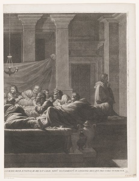 Curator: The drama is palpable, isn't it? The staging and the intensity of feeling… it almost vibrates off the print. Editor: Indeed. We're looking at "Heilig Oliesel (rechter deel)," or Holy Unction, the right section, an engraving that experts date roughly from 1633 to 1700 and which is held at the Rijksmuseum. The print is by Jean Pesne, whose engravings often captured significant historical and religious scenes. Curator: It does carry a weight of historical association. Tell me, does it strike you, too, as an almost theatrical display? Look at the figures clustered around the bed, a real mix of anguish and reverence. Is this about real suffering, or how suffering should be performed? Editor: Well, the sacrament of Holy Unction is, after all, about preparing for death, both physically and spiritually. Pesne captures that moment of vulnerability but also communal ritual, an important process socially and religiously, especially in the context of baroque sensibilities. Think about it: The patient is surrounded not just by priests but what look like family or friends, actively participating in this transition. It blurs the lines between personal and collective experience. Curator: Exactly. And how is the meaning, then, negotiated between these realms? I'm particularly drawn to the gestures. The upraised hands… are they expressions of supplication, or are they directing something divine downward? Even the architecture of the room feels laden with symbolism, particularly how the light interacts with the textures and draping. Editor: You raise an excellent point about light. It serves almost like a character itself, illuminating the patient's body while casting a long shadow from a man standing near. In terms of social context, images like this also helped reinforce the church's role in marking life's major passages. And prints were an important medium because this made potent imagery like this widely accessible. Curator: The availability speaks to its influence. Thank you; viewing Pesne’s print together, focusing on these interwoven perspectives, offers a glimpse into not just religious ceremony but baroque sensibility itself. Editor: Agreed. I appreciate having these moments unpacked, too. Seeing a print like this with fresh eyes always brings new levels of context.