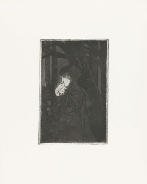 Curator: Let’s take a look at Henri Fantin-Latour's "Standing Bather," created around 1879. He employs printmaking techniques—lithography, etching, drawing on paper. Editor: My first impression is of solitude. The figure is turned away from us, almost blending into the dark foliage. It feels intimate, secretive. Curator: Absolutely. The bathing woman as a subject taps into classical themes, yet here we have this darker, more introspective interpretation. Fantin-Latour, who associated with many symbolist artists, presents the nude figure not as an object of desire, but perhaps an exploration of female identity within the context of nature. Editor: That resonates with me. Consider the printing process itself: lithography demands careful labor, building up layers to achieve depth and texture. The gradations achieved by this method speak to a lived, laborious materiality; here is where the means become the art, revealing the skill, the careful registration, and the work required to create this atmospheric setting, challenging a more elevated tradition for nude figures. Curator: A wonderful point about labor—it underscores the deliberate creation of this secluded, dreamlike realm. Fantin-Latour grapples with societal constraints placed on women through mythological settings where they appear removed from the conventional societal settings of that period. Are we really seeing this bather’s liberation? Editor: Perhaps liberation can be about owning a space even if, like this figure, one’s posture or location remain unfulfilled. We need to consider how Fantin-Latour navigates high art expectations for what nudes do, and how women are seen. He shows us not an idealised, decorative form but someone who perhaps enjoys an introspective interaction with nature; not a passive object. The very choice of etching as a means reinforces accessibility of an intimate moment for contemplation, rather than an uncritical viewing. Curator: You're right. Fantin-Latour prompts us to question and delve into the historical construction of female representation—moving away from objectification and toward a more nuanced understanding. Editor: So by examining both materials, the social context and the production values, the subject invites the viewer to delve beneath the surface... Curator: ...to see an individual, rendered not just as form, but as a nexus of experience and historical context. Editor: Thank you! That changed my viewing for good.