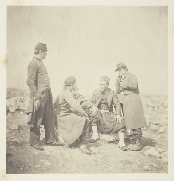 Roger Fenton created this photograph, "L'Entente Cordiale," using the collodion process. Immediately, one notices the casual arrangement of figures against a softly blurred, natural backdrop. The men, presumably soldiers, occupy a shallow foreground space, defined by subtle tonal gradations rather than sharp lines. Fenton's composition invites us to consider the interplay between form and content. Note how the diagonal lines of the seated figures draw our eyes across the scene, creating a sense of movement despite the photograph's stillness. Semiotically, the photograph challenges the traditional war image and instead suggests a moment of quiet camaraderie. The photograph's muted palette serves to unify the composition, emphasizing the formal relationships between the figures and their surroundings. By softening the details, Fenton invites us to focus on the underlying structure of the scene. The photograph, therefore, transcends its documentary function, becoming a site of ongoing aesthetic and cultural inquiry.