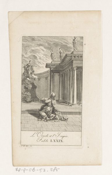Editor: This engraving, "Fabel van de man en het houten afgodsbeeld," created in 1758 by Johann Heinrich Meil, depicts a man about to strike a wooden idol. It's...interesting, I'd say; there's a clear contrast between the man's apparent anger or frustration and the stoic presence of the idol. How do you interpret this work? Curator: I see this piece as a potent commentary on power dynamics and belief systems of the time. It brings into question the relationship between humankind and the objects we imbue with authority. Consider the historical context; the Enlightenment was challenging traditional forms of control. Does this image reflect anxieties about shifting away from established doctrines towards secularism and reason? Who, ultimately, holds the power in this scene? Editor: It's fascinating to think of it as a challenge to power, I originally viewed it as a straightforward destruction of something. What is your take on the figure of the "idol," do you think it is meant to portray only an item to blame? Curator: Exactly, consider this. What if the idol represents not simply a religious figure, but any established institution or ideology? Perhaps Meil intended to provoke questions about the violence inherent in dismantling oppressive systems, and what it costs. By looking at the fable, what are the implications of the man's action beyond destruction? Does the piece suggest this anger is a catalyst for something else? What type of reaction is prompted from viewers of this engraving when confronted by the man´s pose? Editor: It completely changes how I look at it! I thought about the frustration itself. Looking at it through that political lens, as potential liberation, adds a whole new layer. Thank you for offering an intriguing way of analyzing art! Curator: My pleasure! Art is such a reflection of society. Exploring those connections deepens our understanding of both.
