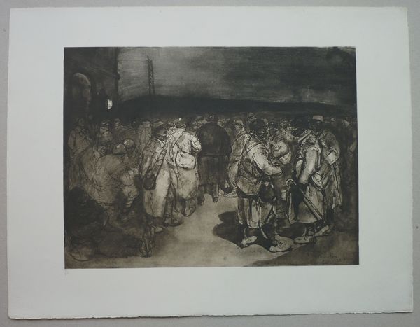 Editor: So, this is Théophile Alexandre Steinlen’s "Les Adieux," created in 1916 using charcoal and ink. It’s a fairly somber piece, depicting what appears to be a crowd seeing off soldiers. What do you see in it? Curator: Initially, the composition strikes me. The contrast between the dark, almost oppressive mass of figures and the small area of light directs the eye. Observe the layering of forms, how Steinlen utilizes chiaroscuro to create depth and evoke an atmosphere of both intimacy and collective sorrow. Editor: The stark contrast definitely amplifies the mood. Is the lack of detail in the figures intentional? Curator: Precisely. It transcends simple representation. Consider the application of the charcoal itself – the varied pressure and density creates texture, almost a physical manifestation of grief. Note the compositional choice to render the faces in shadow; it invites the viewer to contemplate the universal nature of loss during wartime. How do you read the figures' postures and gestures? Editor: I see resignation, maybe some quiet defiance. There's a sense of unity, despite the individual suffering. But beyond that, I hadn’t considered how the charcoal itself contributes. Curator: It’s in those very material choices that the emotional weight of the piece truly resides. It isn't merely a picture, but an embodied emotion constructed by compositional relations, shadow, and texture. Editor: I never considered the technique could have such a prominent impact on the feeling evoked by the piece. It really does underscore the weight and despair in the picture. Thank you. Curator: My pleasure. Reflecting upon how Steinlen used the formal properties of the work has shed light on new perspective about the art’s deeper themes.