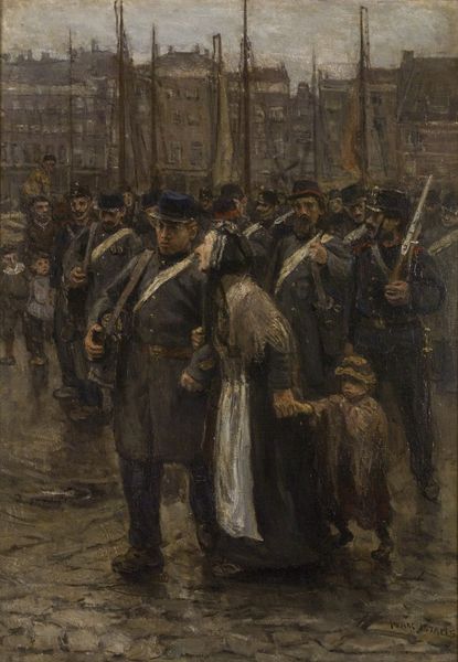 Curator: At first glance, there is a sense of movement here. Somber, almost bleak, but undeniably kinetic. Editor: Indeed. This is "Transport of Colonial Soldiers," painted in 1884 by Isaac Israels. It is currently housed at the Kröller-Müller Museum in Otterlo. A striking piece done in oils that, despite the grand historical context it hints at, almost feels like a snapshot of everyday life. Curator: Snapshot is the right word! Look at how the light reflects off the wet cobblestones, the grays and browns dominating the color palette. Yet, beneath the surface is a symbol of impending violence. Editor: Precisely. Israels’ impressionistic style somewhat softens the harsh realities of Dutch colonialism. We are seeing this procession, presumably embarking to the Dutch East Indies. It's not just about portraying a landscape but also the human cost of imperialism. Notice the weary faces, the forced march. Curator: It’s interesting how the marching soldiers fill almost the entirety of the canvas—almost like the rhythm of the drums, flutes, and marching is a chant that will lull anyone looking into believing the same reality. The lion sculptures are a subtle suggestion of Dutch power at the time. What’s particularly intriguing is the anonymity given to the soldiers, and a particular sensitivity is shown to the locals among the crowd, almost acting as quiet protestors. The family holding hands… they serve as anchors to the reality outside of the military state. Editor: A protest simmering beneath the surface—an uncomfortable truth. Israels uses the familiar, seemingly innocuous, imagery of daily life to speak to something much larger, forcing a reconsideration of historical narratives. One begins to ask what stories are omitted when we frame conflict within romantic or glorifying portrayals. Curator: It serves as a reminder to remain watchful and to delve beneath superficial portrayals of national pride. Even seemingly ordinary scenes might be laced with potent underlying symbols that can remind us to reflect on forgotten memories and uncomfortable events in time. Editor: Absolutely. Art like this encourages a crucial dialogue about whose stories we elevate and whose voices are suppressed. It is definitely a thought-provoking example of Impressionism.