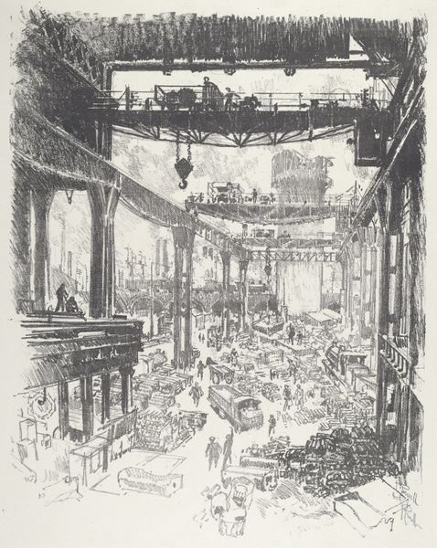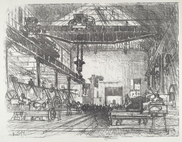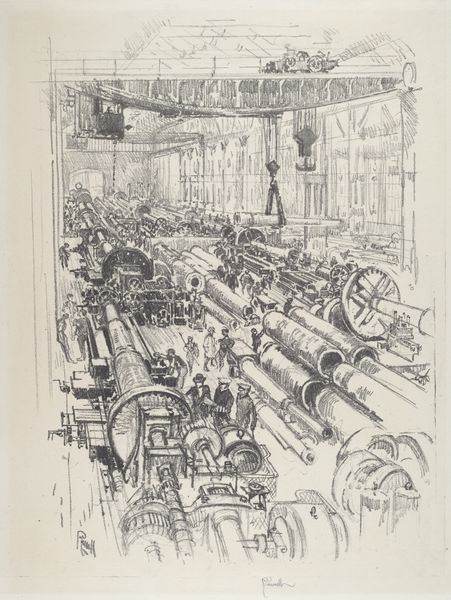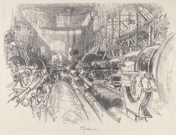 Editor: Joseph Pennell’s 1916 graphite print, "The Cauldrons," just pulls you right in with its incredibly strong perspective. It’s almost overwhelming, like staring into the belly of some mechanical beast. What do you see in this piece? Curator: A powerhouse of industry, yes, but more than that, a monument to human ingenuity, and also, perhaps unintentionally, to our hubris. Look at the way Pennell uses the stark realism of the factory floor, the grimy detail, and then softens it with light – almost a spiritual light – pouring in from above. Do you notice how it elevates the industrial landscape? Editor: It’s like a cathedral made of metal and steam. But I also see a kind of anxiety, maybe because it was created during wartime? Curator: Ah, yes! That's it. Pennell was captivated by the industrial war effort, wasn't he? There's this powerful tension, between the romanticism of progress and the ominous undertones of its purpose, don't you think? He's almost challenging us to see the beauty amidst this unsettling scene. A kind of... dark sublime. Editor: That's interesting – it’s not just documentation, it's also Pennell's reflection. It makes me think about what we consider ‘beautiful’ and why. Curator: Exactly! It is a mirror reflecting our aspirations and anxieties. An amazing print to provoke such introspection, wouldn’t you agree? It whispers, roars, then falls silent, inviting us to listen. Editor: Absolutely! This print has given me so much to think about. Thanks! Curator: My pleasure.