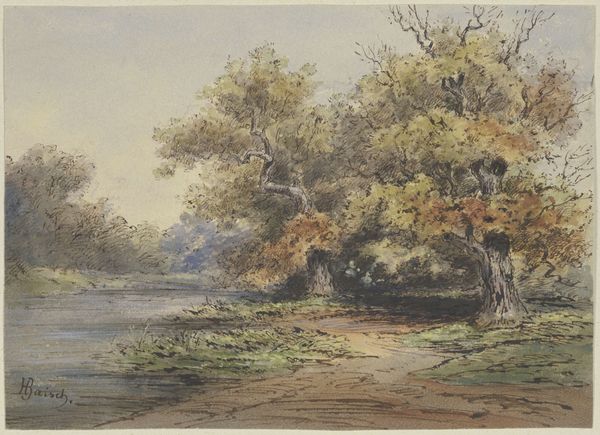 Curator: This watercolor drawing, "Edge of the forest with stream," was created circa 1882 by Jacob Hoffmann. The work is currently held in the Städel Museum collection. Editor: It evokes a sense of serene solitude, doesn’t it? The misty, muted tones create an atmosphere of quiet contemplation. Curator: Indeed. The artist’s choice of watercolor on paper lends itself well to capturing the ephemeral quality of light filtering through the foliage. Observe how Hoffmann meticulously constructs space through tonal variations, subtly shifting from foreground to background. The application of the pigments here feels light, very thin layering. Editor: Absolutely. You can practically feel the humidity in the air. It looks to me like Hoffman sought to explore painting "en plein air", capturing that outdoor landscape quality directly. The small figure on the left seems rather dwarfed by the landscape. Curator: It invites speculation about human interaction with the natural world. We must consider how the very materiality of this work plays a role in this engagement: paper made by hand from cotton rag pulp, brushes from animal fibers... consider all this is required to create what on its face looks simple. Editor: Very true. And I think that's one reason why this appeals to me, the artist capturing that everyday moment. Curator: The composition, with its emphasis on horizontal lines and the reflection in the water, certainly enhances the sensation of stillness. Editor: It truly is a quiet meditation on the intersection of water, foliage, and sky. I imagine one could just lose themselves observing that. Curator: Jacob Hoffmann's delicate rendering has provided us with a space for a moment's reflection.
