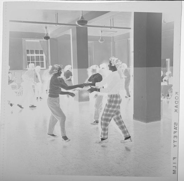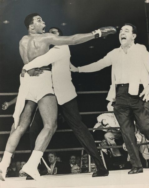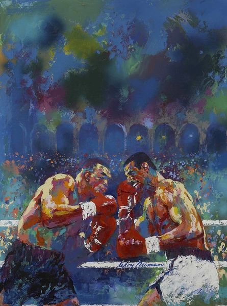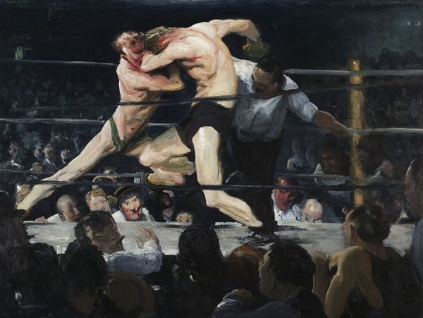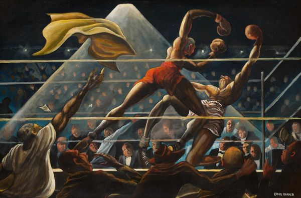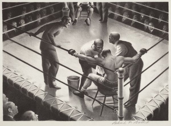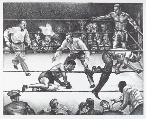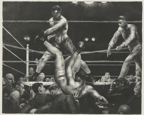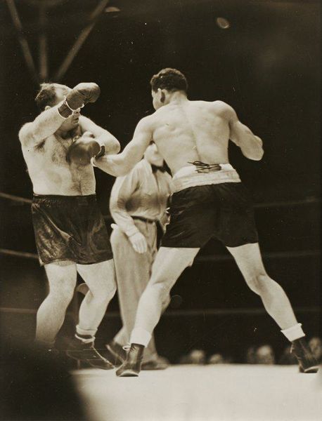 Editor: This silver gelatin print by John Deusing, titled "Untitled (boxing ring knock out)," captures a dramatic moment. The high contrast and stark lighting really emphasize the physicality of the sport. What strikes you about the formal elements here? Curator: Note how the photographer uses the stark contrast to emphasize the dynamic composition. The referee's outstretched arm creates a diagonal that bisects the frame, drawing the eye from the fallen boxer to the triumphant one. The flatness of the image plane compresses the action, heightening the sense of immediacy. Editor: It's like the image itself is a punch. I didn’t notice how the diagonal line really creates tension. Thanks! Curator: Precisely. The photographer manipulates light and shadow, shape and form, to convey the energy of the scene. A photograph such as this invites us to consider the power of formal elements to convey meaning.