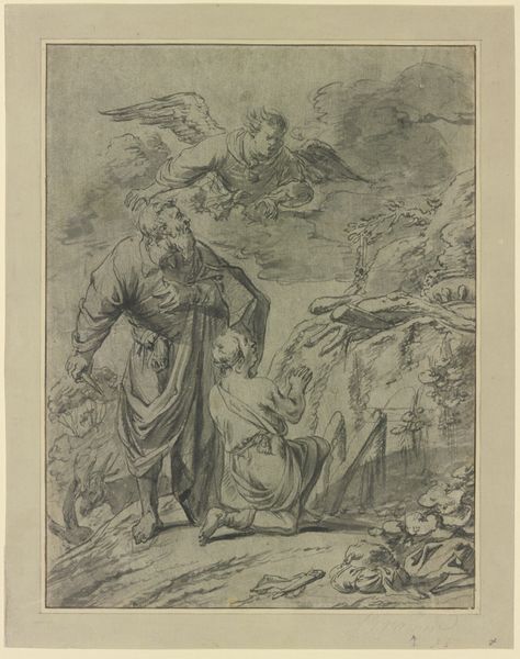Curator: Johann Christoph Liska's rendering of Petrus von Chateauneuf presents us with a complex visual narrative. Liska uses ink, charcoal and watercolor on paper, in a Rococo style, to depict a powerful, and quite frankly, disturbing scene. Editor: The overwhelming feeling I get from this is one of oppressive authority. The figure of Petrus is so much larger than those cowering before him. There's a real imbalance in the composition; the tone is muted, almost washed out, adding to this sense of foreboding. Curator: Exactly. This piece likely functions as both a history painting and portrait art, meant to lionize Petrus. Given the text beneath the image—referring to him as an inquisitor—it is highly probable this work portrays Petrus in his role persecuting those deemed heretics. The figures at his feet, who seem to be twisting away in terror, are key to its political meaning. Editor: And it's a brutal, stark reminder of how power, particularly religious authority, was wielded to suppress dissenting voices and impose a single narrative. It encourages viewers to take stock and connect this image to contemporary mechanisms of oppression. The martyr’s palm seems a little too eager. Curator: The placement of Petrus with his cross, towering above, reinforces a social hierarchy sanctioned, as Liska clearly intends us to believe, by divine decree. Consider the history of the location in which Liska creates this, amid power struggles and shifting political climates. Editor: Which begs the question: whose narrative are we being shown here? How does this depiction uphold or challenge those very power structures? And how does this influence its presentation here, in this gallery, now? Curator: Precisely. A crucial part of understanding historical artworks is questioning why and for whom they were created. It reveals so much about the intersection of power, religion and representation. Editor: Indeed. Ultimately, it encourages us to contemplate the legacies of intolerance and injustice that persist into the present day and hopefully we consider, as a consequence, how to avoid these atrocities.