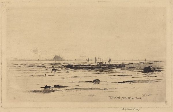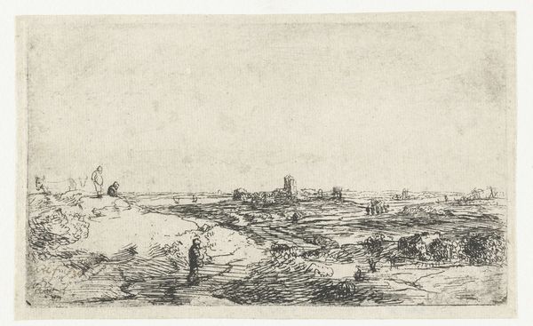 Cornelis Springer made this print, "Overstroomd landschap tussen Oss en Lith" using etching, a printmaking technique that relies on acid to create lines in a metal plate. Springer would have coated a copper plate with a waxy, acid-resistant substance, then drawn his image into the wax, exposing the metal. Immersing the plate in acid would bite away the exposed lines, which are then inked and printed. The fine, precise lines of etching are perfect for capturing the flooded landscape, full of detail. You can see the social impact of such a devastating natural event, the workers trying to go about their daily life, the cattle wading in water, and the figures in boats attempting to navigate the scene. By understanding the labor-intensive etching process, we appreciate Springer's skill in translating the scene onto the plate, capturing a moment of hardship and resilience. This print blurs the lines between fine art and craft, emphasizing the skill involved in both the making and the viewing.