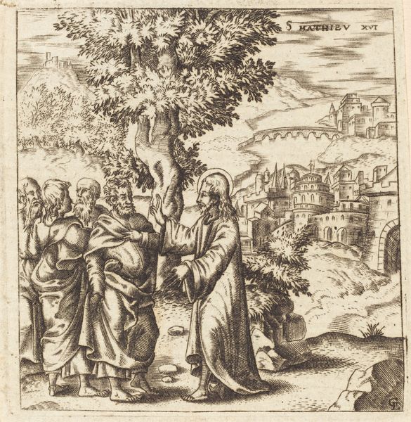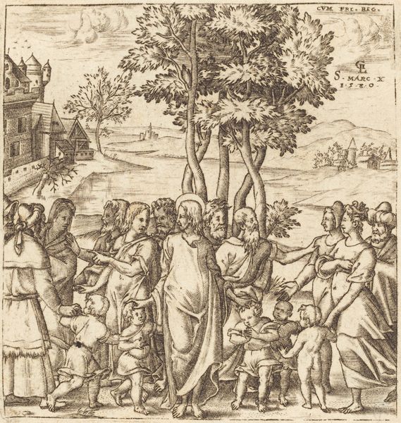 Curator: This engraving, created by Benedetto Montagna around 1515-1520, depicts the Birth of Adonis. What's your initial impression? Editor: It’s strikingly delicate. The meticulous linework creates an almost dreamlike, melancholic scene. I notice the small, seemingly vulnerable figure of the infant Adonis emerging from the tree, almost as if he's being offered to the women before him. Curator: Indeed, the visual weight given to the natural landscape is fascinating here. Considering this work within the context of the Italian Renaissance and its relationship to classical mythology allows for an interesting exploration of gender, power, and the role of women. Are they midwives? Nymphs? Are they complicit in Adonis' tragic destiny? Editor: Precisely. And the image pushes me to ponder what the surrounding culture truly values, the power dynamics at play between mortality and divinity. This tragic narrative becomes an opportunity to reflect on issues around power, social constraints, and maybe even violence, against marginalized individuals in our own era. Are the structures of control any different? Curator: From a more purely historical perspective, Montagna’s use of line and his spatial arrangements really speak to the artistic concerns of the period—particularly in printmaking. He positions us, the viewers, within this idyllic yet fraught landscape. I am also wondering what political symbolism is rooted into it; who does this tale serve to please at the court? Editor: The almost ethereal rendering is beautiful. Is it celebrating nature? Mourning Adonis' ill-fated trajectory? Either way, there's a clear effort here to confront a society that perhaps needs more compassion, something as critical now as it was back then. Curator: Looking at Montagna's choices, I think the artist used what was around him in terms of knowledge and skill. Now it falls upon us to grapple with the enduring themes represented by this engraving within broader frameworks of power and resistance. Editor: Ultimately, the artwork urges its viewers to think critically about established structures and envision possibilities for shaping an existence founded on empathy and respect for nature, life, and beyond.