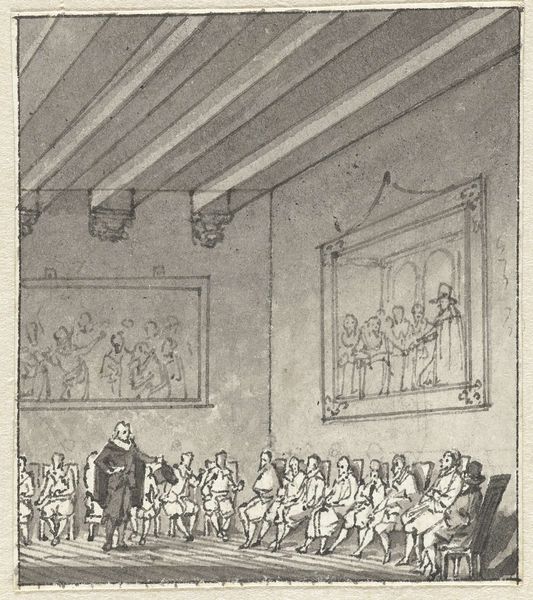 Editor: So, here we have Enrico Nardi's "Swiss Guard in Clementine Hall, Apostolic Palace, Vatican" from 1892. It looks like a charcoal drawing. It feels a little… melancholy, maybe because of all that empty space. I’m struck by the sort of stage-like quality of the hall. What do you see in this piece, looking at it with your expert eyes? Curator: Ah, yes, melancholy resonates. I see Nardi capturing more than just the physical space. To me, it’s a meditation on power and its performance. Look at the solitary guard, almost lost in the vastness. The Swiss Guard are, ostensibly, protectors. Are they protecting history? Themselves? An ideal? It raises questions, doesn't it? Does the stark rendering, devoid of vibrant color, emphasize the weight of tradition, or its potential fragility? It reminds me of Piranesi’s etchings – monumental architecture dwarfing human figures. Editor: That's a great connection to Piranesi! I didn’t pick that up immediately, but that stark contrast between architecture and people is similar. Is that what gives it a somewhat haunting mood? Curator: Precisely! The very architecture becomes another character in this quiet drama. I keep wondering – what just happened here? Or what is about to happen? Is that figure walking away from us, or coming to greet us? The light doesn’t give us an answer. Editor: So it's less about documenting a real scene and more about...conveying a feeling about history and power. Curator: Exactly. Art is rarely a simple mirror. Isn't it funny, how something rendered in monochrome can reveal so many shades of meaning? Editor: Definitely! This drawing has given me much to reflect on.