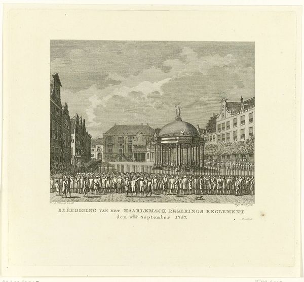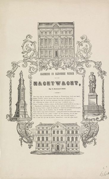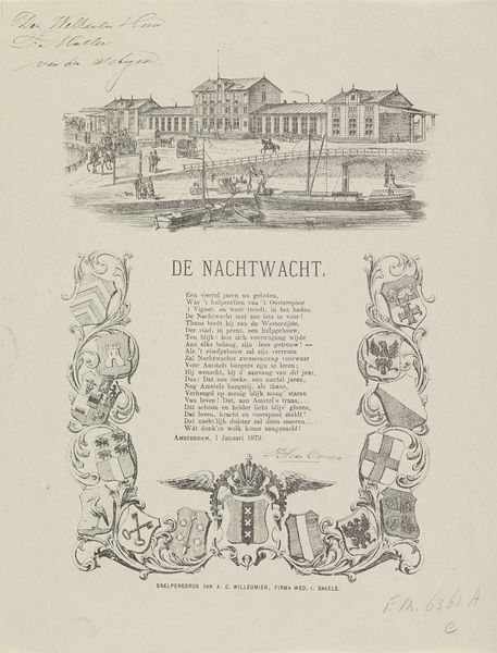 Curator: Here we have the "Nieuwjaarswens van de Amsterdamse nachtwacht voor het jaar 1880," a New Year's greeting made using pen and engraving techniques. The work probably dates to around 1879-1880, give or take a year. What are your initial thoughts? Editor: The combination of a city view above with decorative embellishments surrounding text below feels rather formulaic at first glance, a design made from already made elements. It presents an interesting tension between a seemingly documentary scene and celebratory ornamentation. Curator: Precisely! It's important to view this piece in its socio-historical frame. Amsterdam in 1880 was undergoing rapid industrialization and urbanization. The night watch held significant social roles within the community. Therefore, this New Year's wish can be viewed as a dialogue between those that kept guard, a form of solidarity, a printed form to bridge gaps. Editor: Interesting, seeing it as dialogue between labour positions is what really makes it intriguing, rather than just a simple, singular greeting. It would also be interesting to think of how its means of production influenced accessibility – prints such as these facilitated communication on a larger scale for city officials during a time when artisanal production started changing and new forms of value exchange and relationships to materials began to exist. Curator: And we can further deconstruct that accessibility. While the print may have reached many, its symbolic weight, deeply tied to civic duty, speaks to power dynamics embedded in the urban landscape of that period. Think about the selection of cityscape versus countryside imagery, of pen work replicating the actual act of civic guarding... Editor: Good points! It brings to mind questions of skill, labour, even class that influenced art making. To think about all the material circumstances that influenced not just the look of this particular print, but all others printed like it... Curator: So, despite its initially commonplace appearance, “New Year’s Wish from the Amsterdam Night Watch for the Year 1880” invites reflection. It acts as a symbolic representation of labour hierarchies interwoven with the broader social and political conditions of 19th-century Amsterdam. Editor: Indeed. Thinking about production and means of dissemination sheds some light into a common everyday expression, reminding us that everything, even a new year's greeting is produced out of certain conditions.