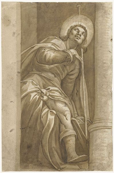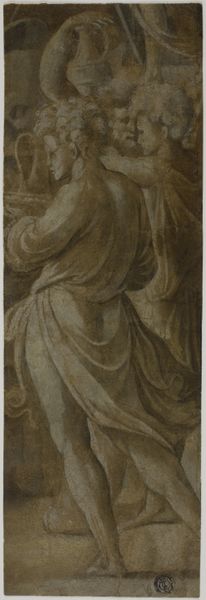 Curator: We're standing before Bernardino Campi’s “Two Standing Prisoners in a Niche,” dating back to about 1549 and held here at The Art Institute of Chicago. It’s a striking piece rendered with ink and gouache on toned paper. Editor: My initial impression is one of confinement, but also a strange sort of… monumentality. The way the figures are positioned feels like they're sculptures carved directly into the niche. The use of ink and gouache is so skillfully manipulated to mimic the texture of stone or plaster. Curator: Exactly. And the subject matter is no accident. Campi was active during a turbulent period in Italian history. This work offers a fascinating glimpse into the sociopolitical climate through its depiction of captivity. Who are these prisoners, and what statement is Campi making by immortalizing them in art? Editor: The labor! Think about the process—preparing the paper, mixing the gouache, then applying the ink to achieve such depth. The toned paper especially contributes a warmth which then underscores the coolness of the niche, which heightens the human experience of the two figures here and the sort of isolation being created in that way. Curator: I see what you mean. Their captivity becomes the focal point, emphasizing the fragility of freedom and the consequences of defying societal norms of the period. You can really see that in the gaze of the figure looking back towards the viewer. It's heavy, drawing you in and evoking complex ideas around authority. Editor: Absolutely. And I’m drawn to think, were they complicit in making this a representation of themselves? Consider that Campi used materials available during the time—the gouache likely made with local pigments, the paper perhaps pulped from recycled textiles. These aren’t just strokes of ink but indications of material possibilities within societal constraint, echoing the themes of captivity itself. Curator: That's a compelling point. Campi masterfully uses art as a vehicle for exploring themes of power, marginalization, and, frankly, the very notion of justice within Renaissance society. The level of detail is exquisite! Editor: Definitely a study in contrasts – between constraint and monumentality. I'm struck by how the materiality informs our understanding of these figures and the very social systems represented by this particular making process. Curator: And how their representation continues to evoke emotion in today’s audiences. It makes you wonder, who exactly decides what is imprisoning. Editor: Yes, which in itself becomes its own act of liberation, for sure.