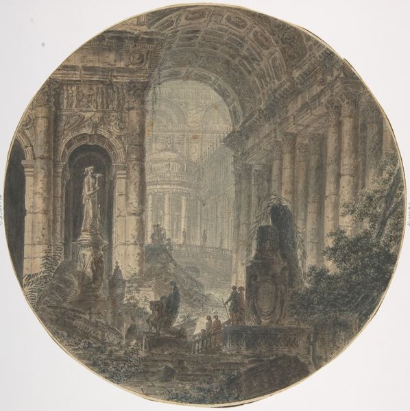 Jean François Janinet created this print of a Roman ruin with etching and aquatint. Notice the circular frame, a structure which immediately invites us to contemplate a contained world. Inside, Janinet presents a space that is simultaneously ordered and decaying. The architecture, rendered with precise lines, suggests a rational structure, yet the ruin is overgrown with vegetation. The pale washes of color enhance the sense of melancholy, a meditation on time and decay. The human figures scattered throughout the scene emphasize the scale of the architecture, underscoring humanity’s relationship to history. Like Piranesi, Janinet uses architectural spaces to frame existential themes. The ruin becomes a signifier of lost grandeur. It destabilizes our notion of permanence, inviting contemplation on what remains and what fades. The composition invites us to consider how Janinet uses form to explore the relationship between the past and the present. It is a visual elegy, an artwork which turns a ruin into a poignant reflection on time.