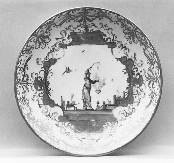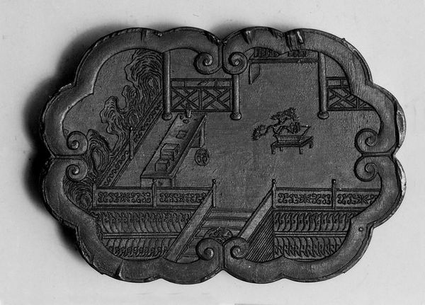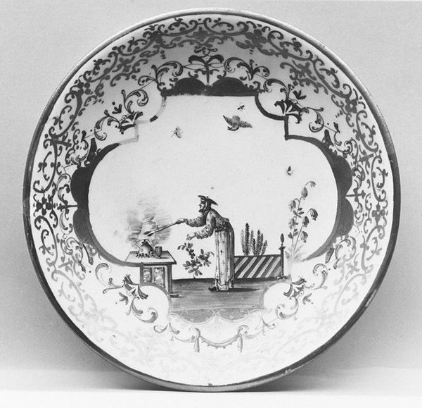 Curator: Here we have an oval plaque created between 1730 and 1740 by Jean-Baptiste Guillibaud. It’s a testament to the Rococo era's decorative arts and is currently held in the Metropolitan Museum of Art. Editor: My first impression is of incredibly delicate linework. The black and white palette adds a crispness to the otherwise elaborate composition, doesn't it? Curator: It certainly does. This piece encapsulates the aristocratic sensibilities of its time. Note how genre painting meets the female nude – a fashionable pursuit within courtly circles during the Rococo period. Think of it reflecting specific power dynamics! Editor: The composition, however, is really arresting. The central vignette enclosed in a circular frame with a seated woman surrounded by decorative motifs… there is so much packed into the picture plane. And is that mother-child figure reflected in a mirror? It brings up some compelling questions about image construction! Curator: Indeed. The piece speaks volumes about 18th-century French society. Guillibaud captures an atmosphere that thrived on refinement, sensuality and artistic innovation, influenced by salons and wealthy patrons. Editor: True, yet there's something intrinsically playful in how he arranges the botanical motifs. Notice the curvilinear shapes and flourishes of the Rococo, almost dancing around the primary figure. Curator: The choice of ceramic as a medium for what is essentially a sculptural object contributes further meaning. This suggests a movement away from more ostentatious materials towards art objects that served both functional and aesthetic purposes in private aristocratic homes. Editor: I am especially drawn to the contrasts the artist is making between public display and private interiority; and it feels really present as you move across the visual space. It provides much food for thought. Curator: This plaque is evidence that artistic innovation can be about the most delicate brushstrokes used for social documentation. I feel that offers today's viewer an invaluable connection to the social attitudes and power structures of its time. Editor: And the delicate balance the artist creates using form, theme, and presentation adds even more compelling nuances to understanding image construction during this period.