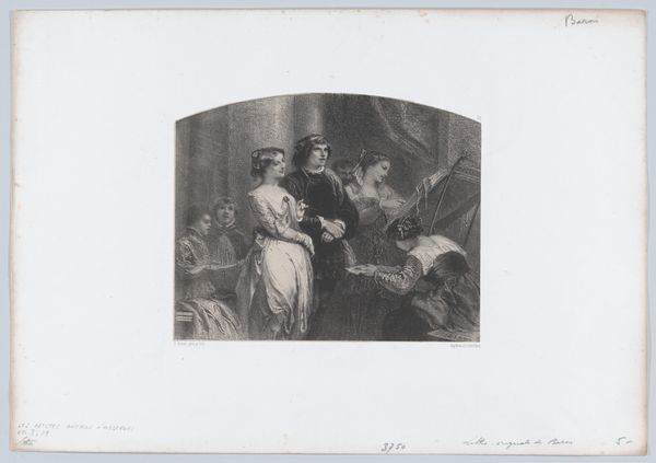 A. Girardot made this print, Musicerend Italiaans gezelschap, or Italian Musical Company, at an unknown date. The print invites us to consider the romanticized image of Italian culture that circulated in Europe, particularly its associations with music, passion, and picturesque landscapes. We see the image presents a trio, perhaps street performers, set against a backdrop suggestive of the Italian countryside. How might we view the ways in which such representations both exoticize and idealize Italian identity? The women, with their intimate pose and delicate features, evoke notions of beauty and femininity, while the man's animated expression suggests the passionate spirit often attributed to Italian men. The presence of the violin underscores the centrality of music as an expression of Italian identity. It emphasizes the emotional and sensory experiences linked to cultural stereotypes. This piece invites us to think about the complex interplay between cultural fantasy, national identity, and individual expression.