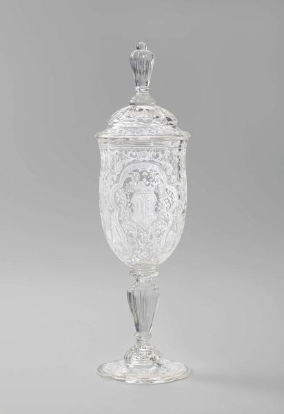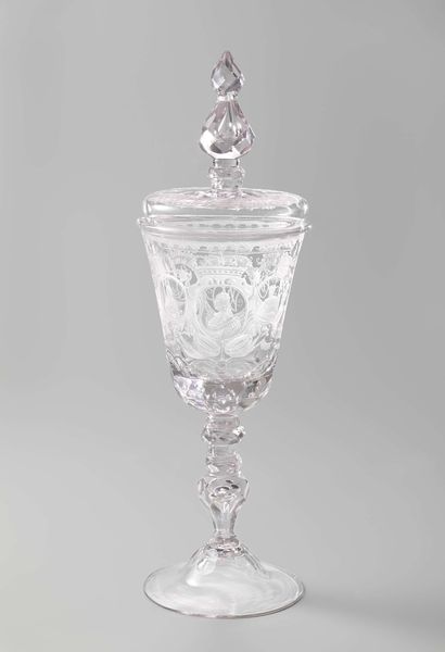 Editor: Here we have a glass lid for a "bokaal", dating back to around 1775 to 1809. It's an anonymous piece, and the glasswork has an almost delicate quality. How do we unpack the cultural implications of something seemingly so simple? Curator: Well, first, consider glass itself as a material. During this period, glass production was shifting from artisanal craft to industrial manufacture. What does the elaborate, decorative nature of this lid tell us about the intended consumer and the society from which it emerged? Who was displaying this type of status symbol? Editor: I see your point. It definitely feels like an object made for display, for a privileged class. Rococo style, right? Is that relevant here, besides the date? Curator: Absolutely. Rococo, with its emphasis on ornamentation and lightness, often served as a visual language of aristocracy. Considering the era’s revolutionary ferment, what statement might such extravagant display have been making, consciously or unconsciously? Whose labor produced it, and who benefitted from its display? Editor: So, this isn't just a lid; it’s a symbol caught in a historical power dynamic. It represents the lavishness of a ruling class during a time when many were struggling. Curator: Precisely! Its delicate nature almost belies its forceful implications, don’t you think? How can we use seemingly fragile objects like this to tell compelling, crucial histories? Editor: I do. Now that I'm considering how seemingly unimportant objects play into broader discussions of power and labor and all, I think that it brings new meaning to it for me, to any object, actually. Curator: It makes you wonder, right? What are the unspoken histories objects carry? And what do those histories reveal about gender, race, and politics? Editor: Exactly, and that's what makes art so powerful, doesn't it? Curator: Indeed. Never underestimate the revolutionary potential of the decorative.