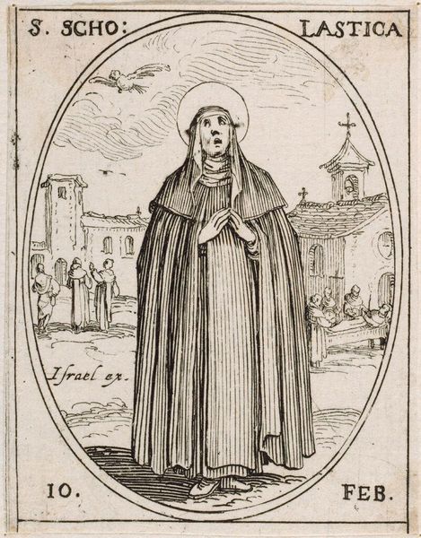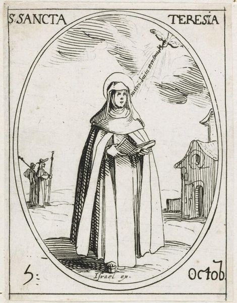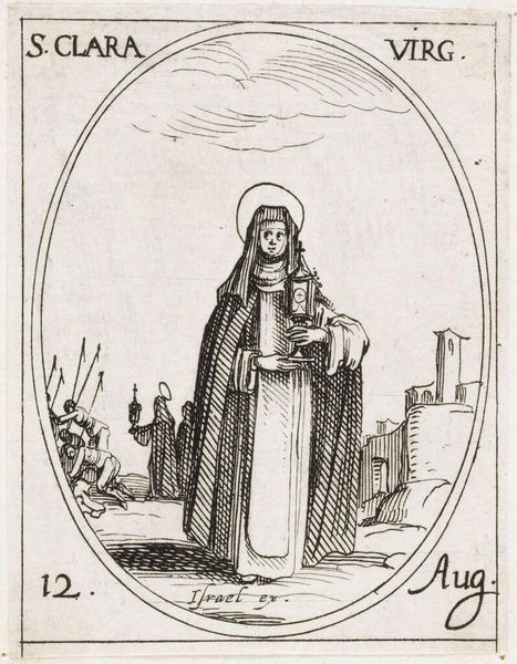 Curator: Jacques Callot's "Saint Othilia," a small etching, presents a fascinating figure. It strikes me as austere, almost severe, in its stark simplicity. What's your take? Editor: It feels like a whispered secret, doesn't it? All those delicate lines creating this feeling of quiet strength. I wonder what Othilia's story might reveal about the representation of female saints. Curator: Othilia is the patron saint of eyesight, often depicted restoring sight to herself or others. Callot, here, places her against a backdrop that echoes themes of faith and healing in a gendered context. Editor: I'm drawn to the background detail—almost like a hazy dream. Is that supposed to represent a baptism? And that broken column—is it symbolic of something lost, or perhaps, something rebuilt? Curator: The column resonates with ideas of resilience and the fragmented nature of historical narratives. The figures in the background do recall baptism, crucial to Othilia's narrative in which baptism restored her sight. Editor: It is fascinating how such a tiny image can hold so much symbolic weight. It makes you wonder about the power of art to convey these huge concepts on such a small scale. Curator: Absolutely, and it prompts us to consider the complex relationships between disability, faith, and representation in early modern Europe. Editor: Indeed! It's like Callot is inviting us to dive into a rich history, one thread at a time.