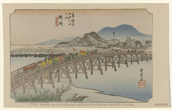 Editor: Here we have Utagawa Hiroshige’s "Nihonbashi in Snow," a woodblock print from the 19th century. It has a stillness to it, despite the people crossing the bridge. What jumps out at you when you look at it? Curator: The bridge, obviously. It dominates the visual space, but it's not merely a physical structure. Bridges are potent symbols. Think about it - they connect disparate spaces, facilitate transition. What might the cultural connotations of bridges be in 19th century Japan? Editor: I guess it represents connection, literally connecting different parts of the city or different social spheres? Curator: Precisely! But go deeper. Note how the snow softens the edges, blurs the details. Snow, like a bridge, is transformative, isn't it? It covers, obscures, unifies. Does that symbolism relate to how people felt about urban expansion during that era? Editor: That's interesting, the blurring almost makes it more… universal? The cityscape feels both specific and timeless. It seems like it captures a moment. Curator: Observe also the composition. Mount Fuji sits serenely in the background, a steadfast emblem amid the bustling life crossing over the bridge. The woodblock style lends a graphic, stylized quality. And even beyond what’s depicted, consider the print medium itself: repeatable images spreading culture quickly to many people. A powerful communication tool, wouldn’t you say? Editor: Definitely! I hadn’t thought about the symbolism of the snow so much, and it really makes the entire scene richer, adding to that stillness I noticed at the beginning. Curator: Exactly. Hiroshige wasn’t just depicting a landscape, he was embedding it with layers of meaning. Visual culture encodes collective experience – symbols and history combined.