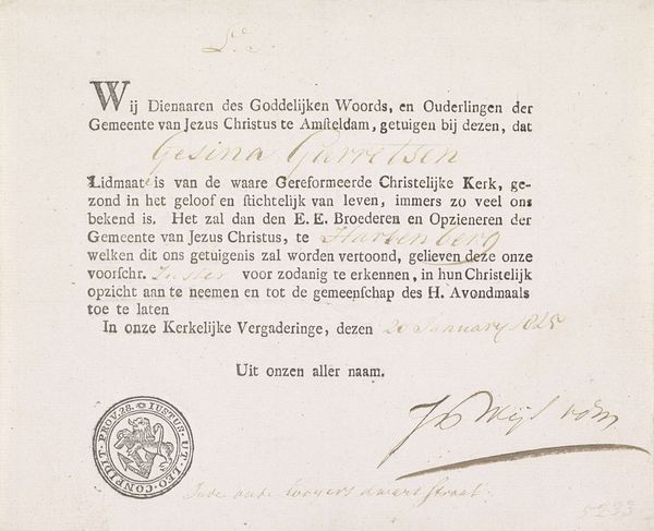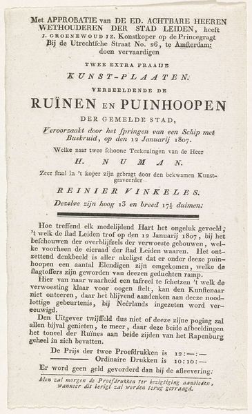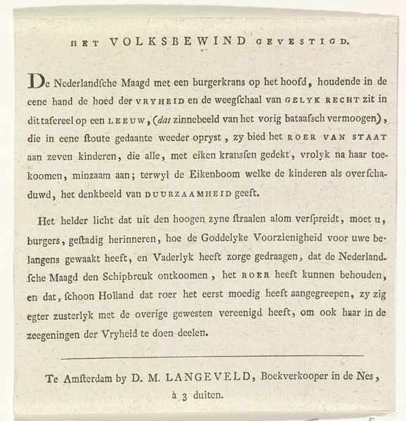 Editor: Here we have "Aanstaande Eenheid en Onverdeelbaarheid van het Bataafs Gemenebest," a print on paper from 1795, created by Dirk Meland Langeveld, currently held in the Rijksmuseum. It looks like a poster with quite a bit of dense text. It seems to capture a very specific moment in history… but I'm not quite sure what to make of it. What do you see in this piece, from a historical viewpoint? Curator: This poster presents us with a fascinating window into the socio-political upheavals of the late 18th century in the Netherlands. We’re looking at a piece of political propaganda, produced during the Batavian Republic, a period of revolution and French influence. Neoclassicism emerges from its aesthetic components like straight lines and hierarchy, imbuing it with its sense of order and reason as the preferred aesthetic style for revolutionary messaging. Consider what that signifies, its preference and values? Editor: So, it's a piece of propaganda promoting a unified Batavian Republic… the text does talk about unity and indivisibility. The angel mentioned in the text is also wielding seven arrows, which they unite. But what does that represent exactly? Curator: The angel, presumably representing the Netherlands, gathers “seven arrows”, representing each Province that formed The Republic in that moment, which needed to act as one force. Notice the language used, the emphasis on burning away inequality, privilege and oppression. It speaks to the revolutionary fervor aiming to dismantle the old aristocratic order and establish a more egalitarian society, under that very important and ever-present Goddess of Reason from Classicism. How do you think its format of a “poster” changed accessibility of revolutionary materials for Dutch people? Editor: That's a great point; making this message something people could purchase or see posted publicly definitely broadened its reach! It sounds like this poster offers us a glimpse into a very turbulent, transformative moment. Thank you. Curator: And understanding this artwork really necessitates situating within its specific socio-political circumstances and neoclassical visuals! A quite productive method to approach analyzing historic works.