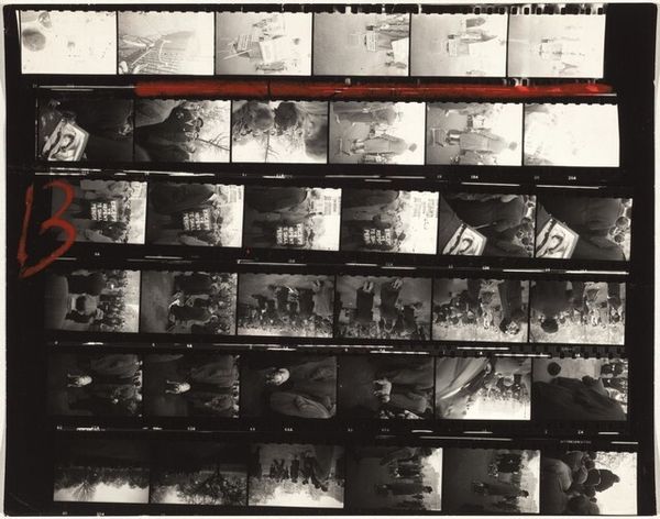 Editor: Here we have Robert Frank’s photograph, "Peru, page 19", created in 1948, using gelatin silver print. I’m struck by the arrangement of hats against what appears to be a newspaper-covered wall. The textures create this almost overwhelming sense of… layered reality. What do you see in this piece, from your perspective? Curator: The formal elements are certainly striking. Consider the interplay of circular forms—the hats themselves against the rectangular ground of newspaper. It creates a tension, a visual push and pull. Notice how the light falls unevenly, highlighting some hats and obscuring others. It is more than just documentary; the structural integrity is intriguing. Editor: The high contrast really jumps out now that you mention it. Did Frank intentionally emphasize those geometric relationships, or am I projecting? Curator: Intention is difficult to ascertain definitively, but the composition suggests a deliberate strategy. He's using tonal variations to establish a visual rhythm. The hats become signifiers within a system. Observe the almost mathematical progression across the plane. The dark hats near the bottom acting as anchors? Editor: Yes, they add a sense of grounding to an otherwise potentially chaotic image. Are we meant to read into the contrast between the uniformity of the hats and the disordered text, some deeper narrative perhaps? Curator: I hesitate to assign a concrete narrative. For me, it is the relationship of forms, textures and light that communicates. The photograph creates a kind of language through the structure, its components working together. A grammar of visual experience. Editor: I’m starting to appreciate how the simplicity of subject matter is elevated by the complexity of the composition. Thank you, it’s a completely different photograph for me now. Curator: Indeed. It reveals its richness upon closer structural examination.