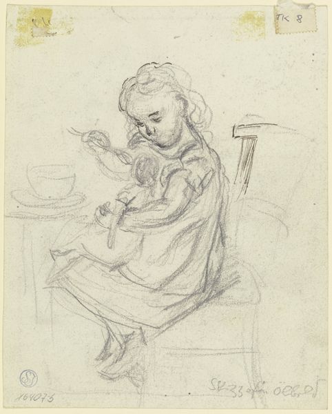 Curator: Here we have Otto Scholderer's "Mandoline spielende junge Frau," or "Young Woman Playing the Mandolin," created circa 1870. The work, a delicate pencil drawing, currently resides here at the Städel Museum. Editor: There's a quiet intensity to this piece; despite being a preliminary sketch, the girl looks almost directly out with a composed stare. Her features feel so familiar. Curator: It’s fascinating how Scholderer captures the texture, or rather, the implied texture, with such economy of line. Observe how the light catches the fabric of her dress and the soft curls around her face. It's a lesson in suggestive rather than descriptive mark-making. The whole composition revolves around her as subject. Editor: Mandolins often symbolized romantic sensibilities and artistic expression during this period. It was seen as feminine but associated with a particular class. This portrait presents a subject embodying artistic pursuits, a muse perhaps, elevated by her mastery of an instrument so tied to cultural performance. But beyond her refined beauty, the instrument alludes to social privilege. It's about much more than aesthetic elegance. Curator: Precisely, the strategic placement of the hands also generates focus. The viewer's attention is expertly guided along their contour lines, emphasizing not only the action of playing, but also the implied tactile experience with the material substance of the instrument itself. The formal composition directs the semiotic content, doesn’t it? Editor: That’s right, her look of absorption suggests that she is playing and completely transported by it. Yet, there is a melancholy cast; as if the artist knew about inevitable transformation, reflecting transient joy that all women— and all beauty—will go through. Curator: The soft gray scale and unfinished elements of the background force our gaze onto her form, into an interplay between what is depicted, what could be depicted, and, indeed, what the essence of 'young woman playing mandolin' is beyond surface depiction. Editor: The very act of portraying her with this instrument immortalizes this cultural symbolism and freezes her within this timeless visual narrative. It makes you consider where beauty resides – is it in art, music, both or the player themselves? Curator: Exactly. The material rendering and composition perfectly capture the transient relationship between technique and the essence of the sitter and the overall idea, and her symbolism.